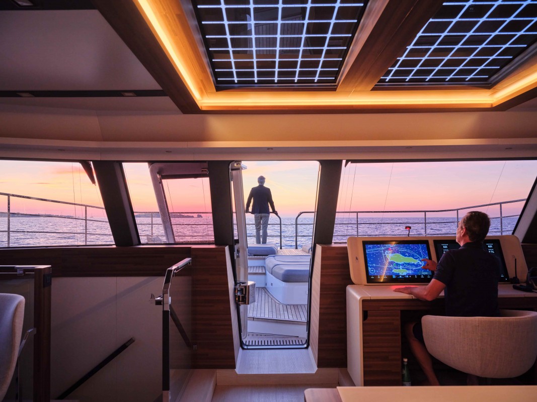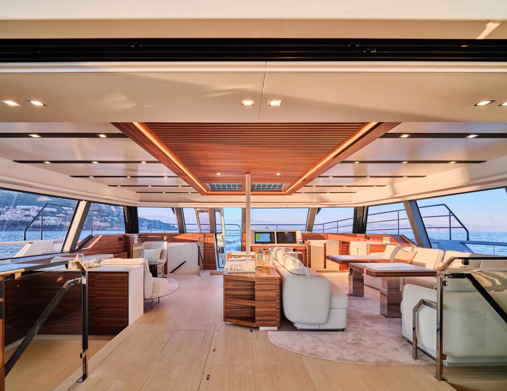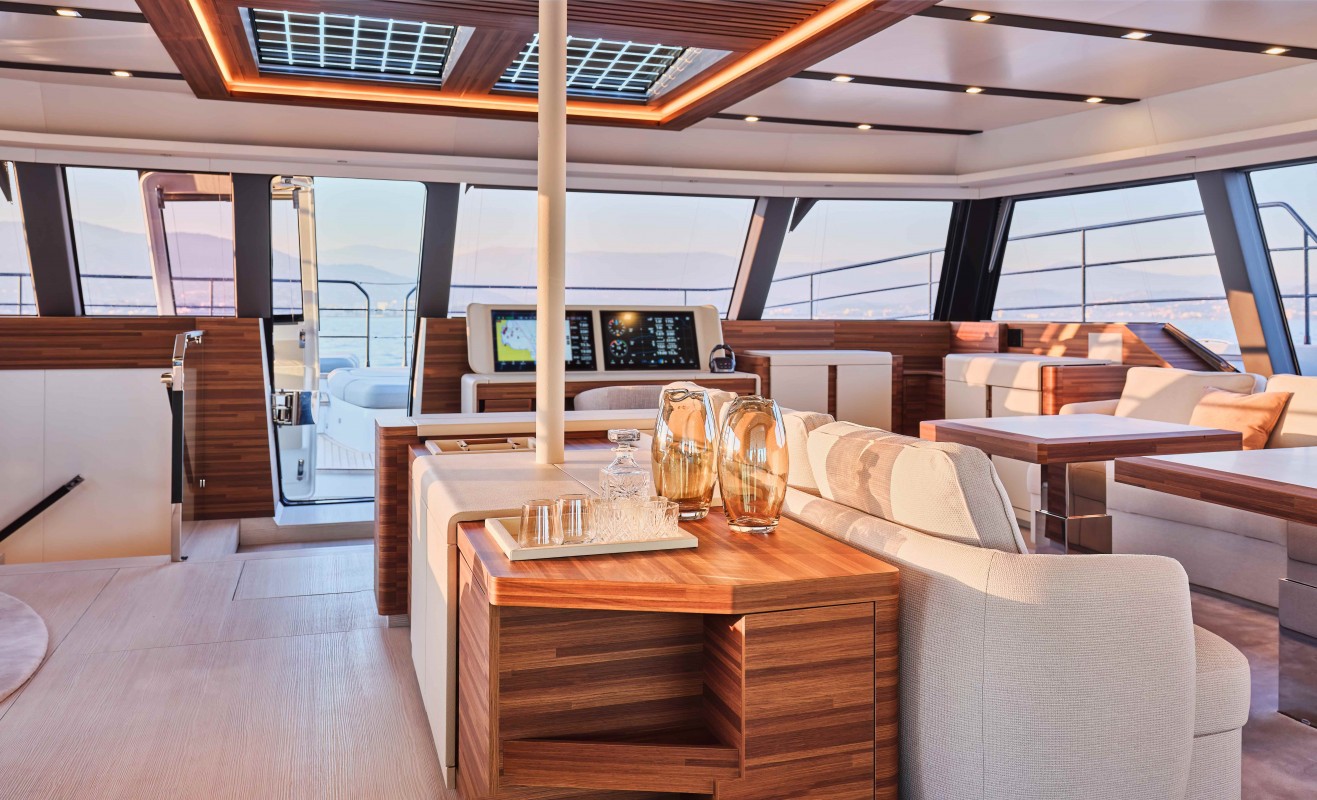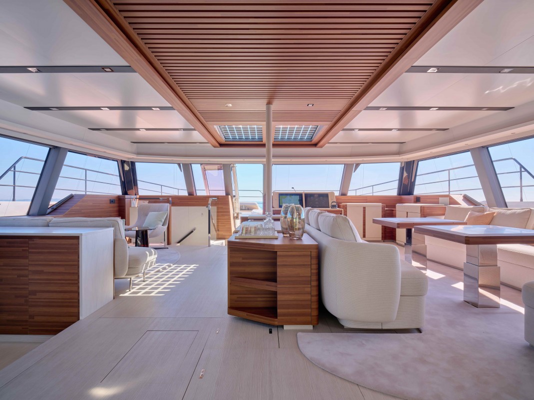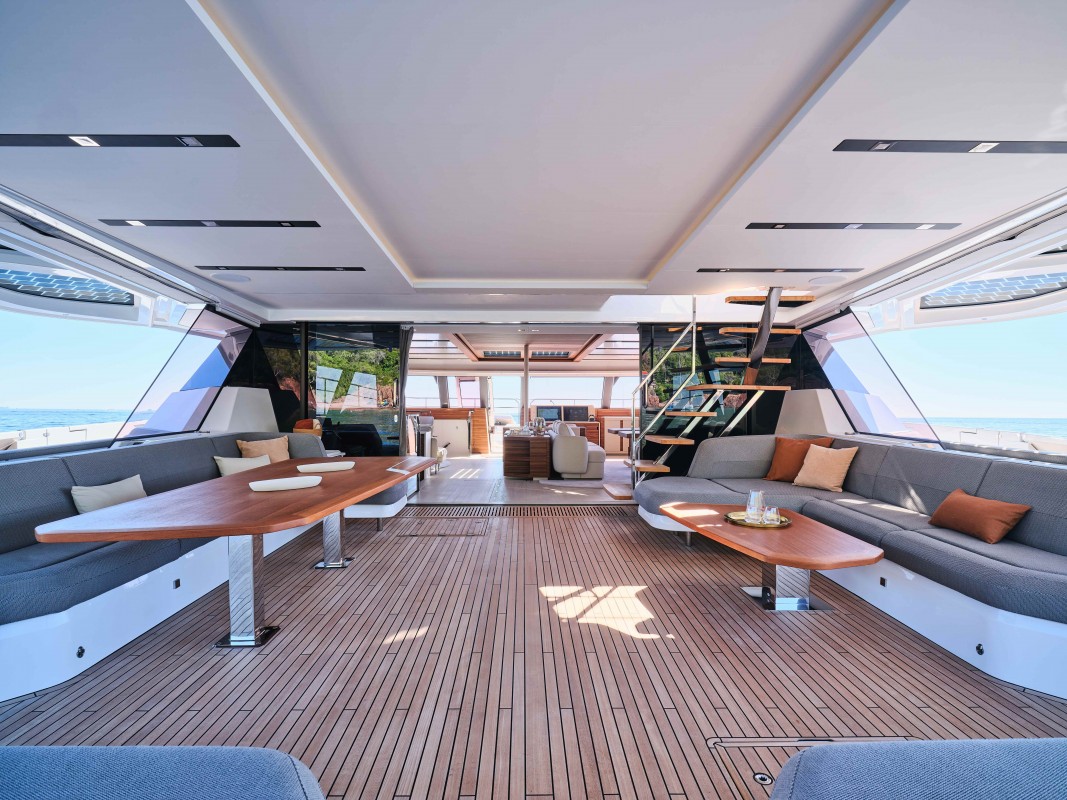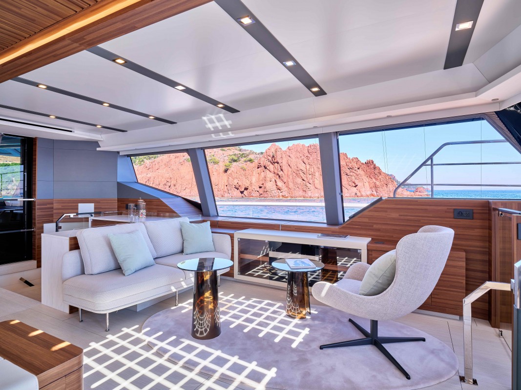 À bord, tous les volumes ont été pensés pour créer un confort exceptionnel, en navigation comme au mouillage. La grande baie vitrée du carré s’ouvre largement pour connecter harmonieusement les espaces intérieurs et extérieurs. Les circulations simples et sécurisées relient naturellement le carré panoramique, le cockpit, le flybridge et la plage arrière. Les grandes ouvertures latérales baignent le s