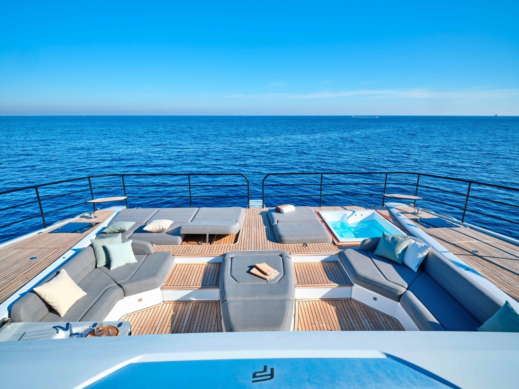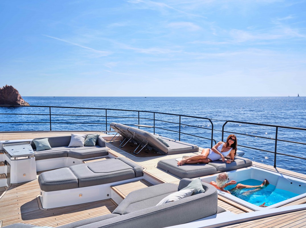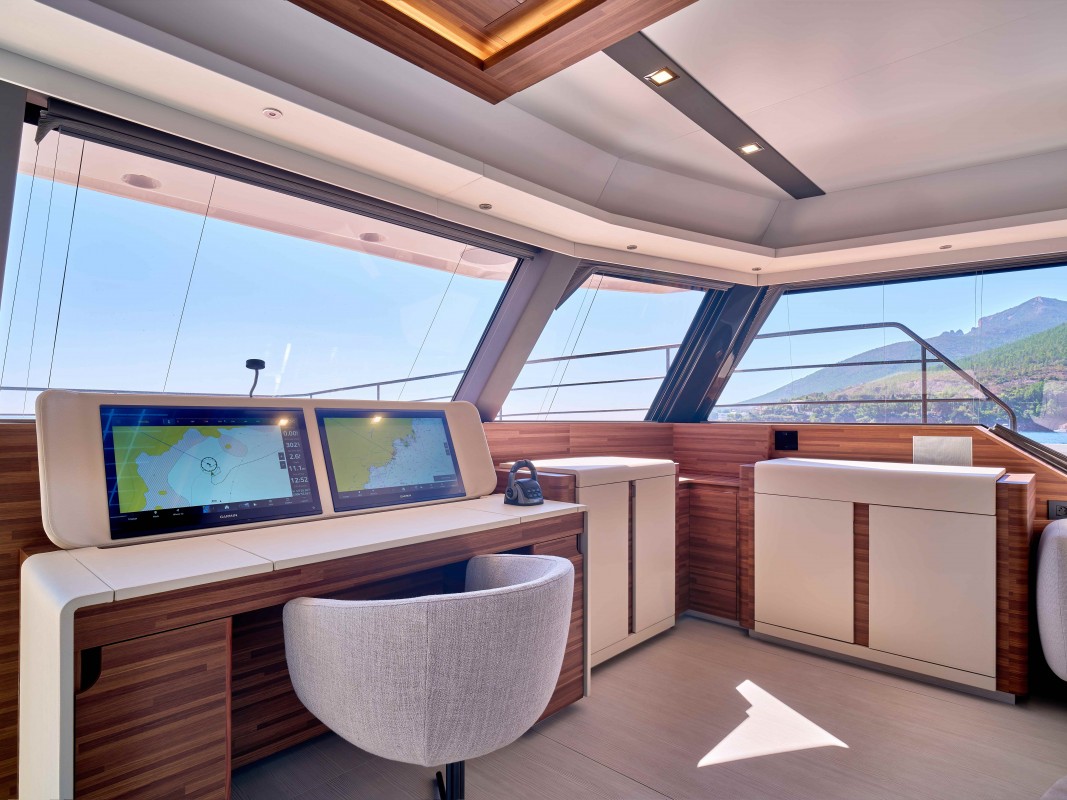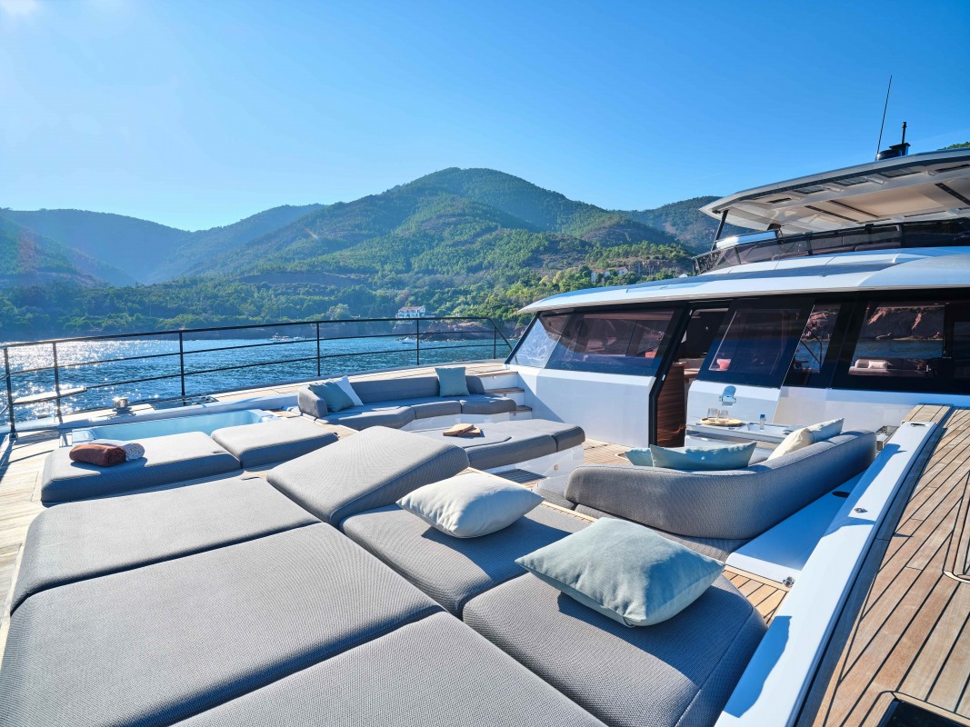 Une véritable leçon de design : ses lignes tendues et contemporaines, malgré des dimensions généreuses, offrent l’harmonie et le prestige habituellement réservés aux unités bien plus imposantes. Conçu pour des navigations confortables et plaisantes, il allonge avec aisance son sillage lors des longues traversées tout en restant simple à manœuvrer en escale. Le poste de pilotage, ergonomique et parfaitement positionné, réunit toute l’instrumentation pour une visibilité optimale. L’équipage profite également de nouveaux espaces de détente : un flybridge spectaculaire, une plage arrière accueillante, ainsi que de vastes bains de soleil parfaitement intégrés.