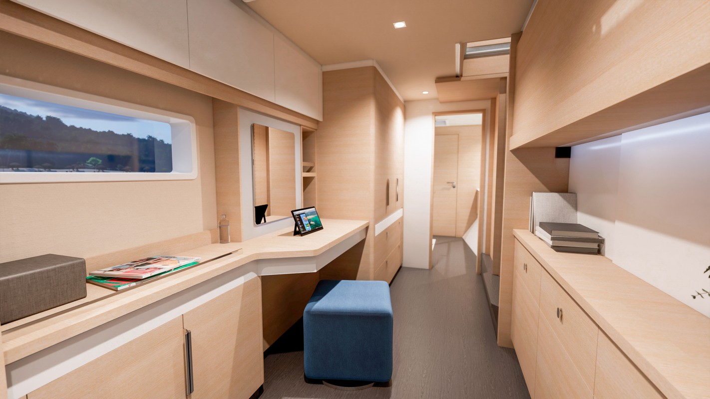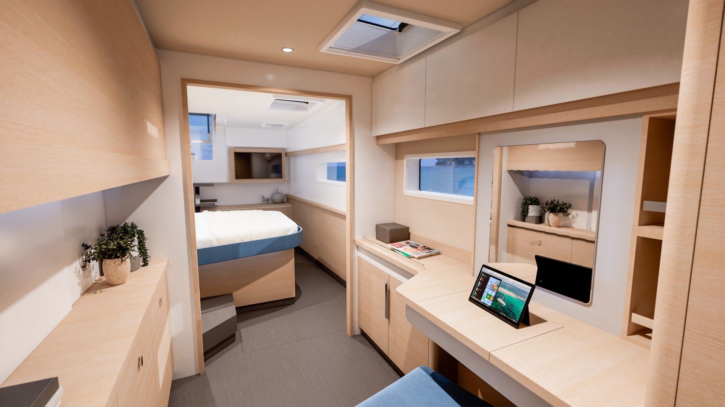 Une partie propriétaire inédit sur un catamaran à voile de cette taille, avec une suite occupant toute la coque bâbord, avec sa pièce multifonction, convertible optionnellement en dressing.