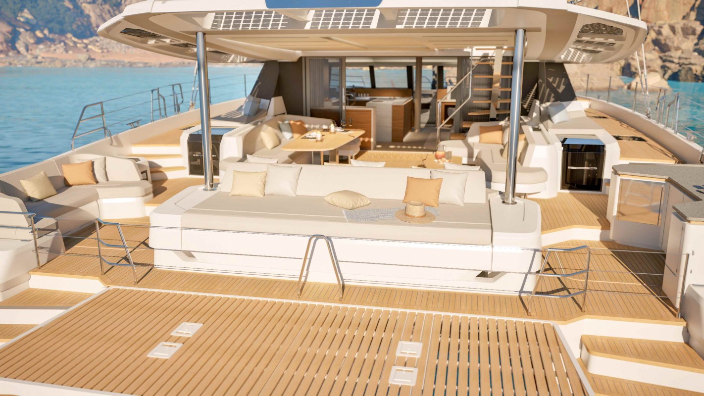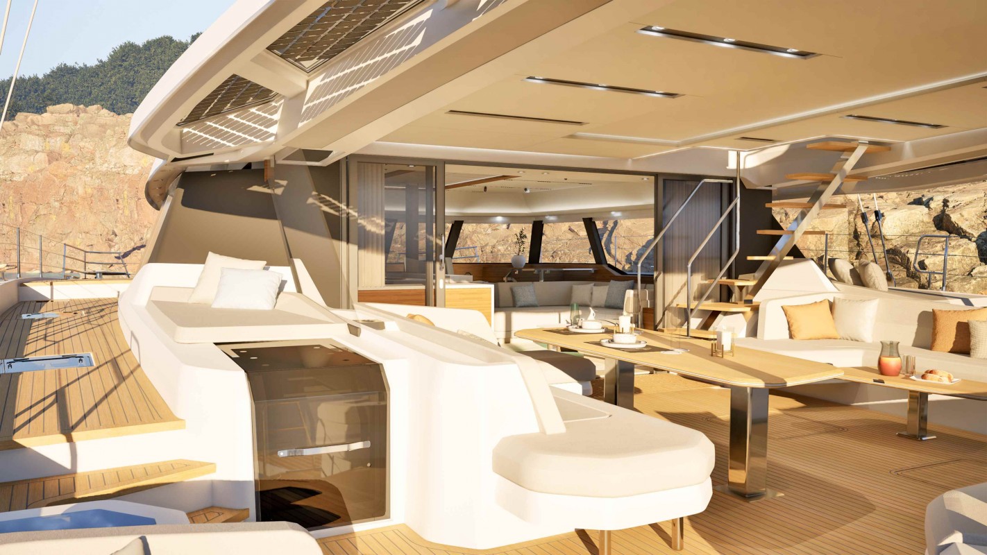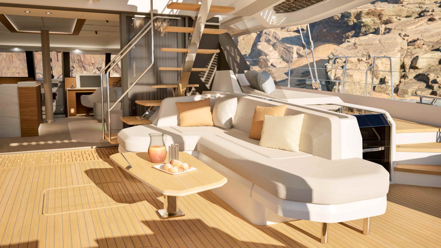 Long de 22 mètres, avec 226 m² d’espaces habitables, le FPY 70S se vit comme une résidence en mouvement, ouverte sur l’horizon. Jusqu’à 12 hôtes et 5 membres d’équipage y trouvent leur espace, leur respiration. Salon sur terrasse arrière de 51 m², flybridge panoramique de 31 m², salon sur terrasse avant équipé d’un spa de 26 m², suite Maestro de 25 m²… Chaque volume favorise le mouvement naturel, l’échange ou le retour l’intimité. A l’arrière, le beach club articule détente et plaisir actif : solarium, plage de bain hydraulique, vaste rangement pour les loisirs nautiques. L’océan devient votre terrain de jeu personnel.