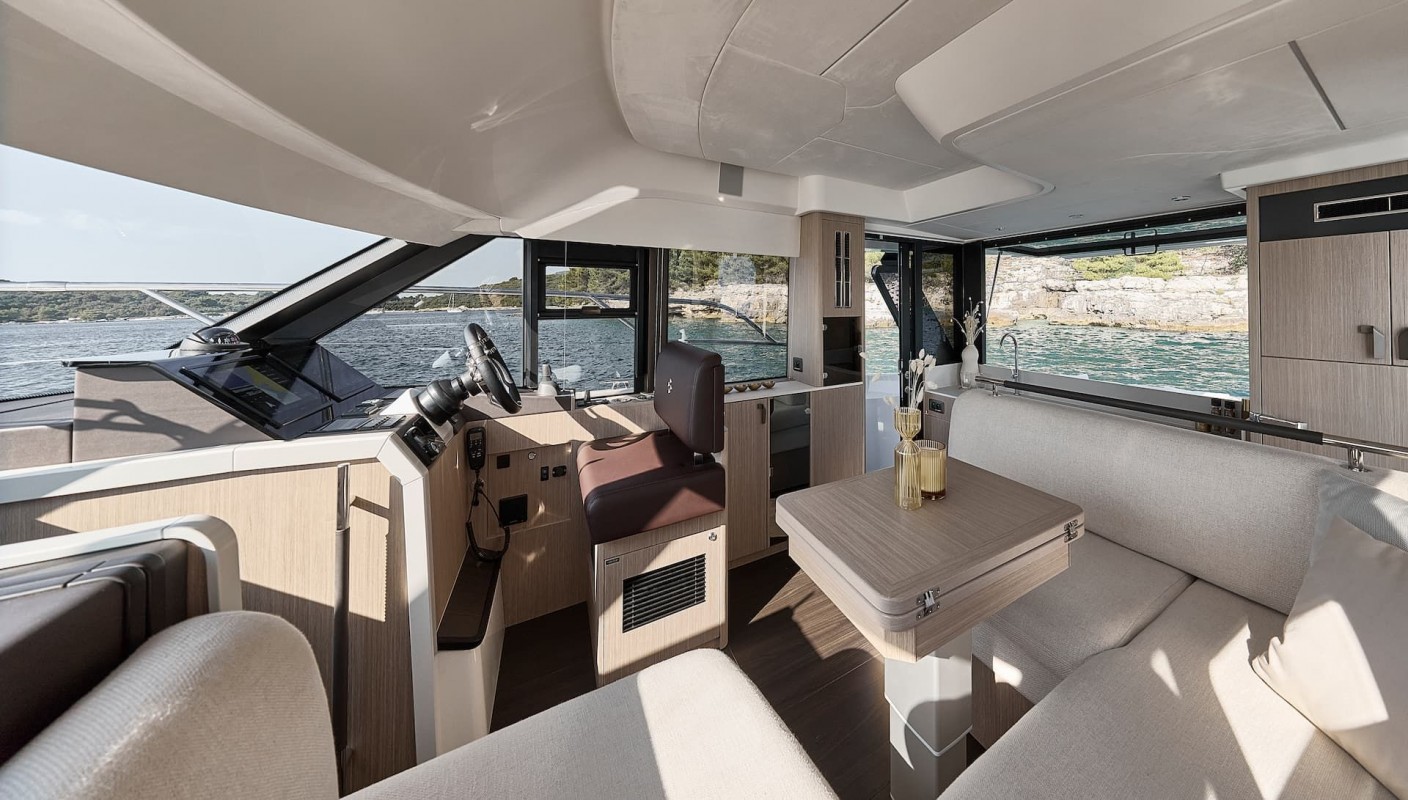 À l’intérieur, le PRESTIGE F4.3 dévoile une atmosphère raffinée et résolument contemporaine. La cuisine arrière, ouverte sur le cockpit, favorise les échanges et la convivialité. Le salon panoramique, baigné de lumière naturelle grâce aux larges vitrages, offre une vue imprenable sur l’horizon. Les finitions soignées, les matériaux haut de gamme et l’agencement intelligent des volumes font du F4.3 un yacht où confort, élégance et fonctionnalité se conjuguent parfaitement.