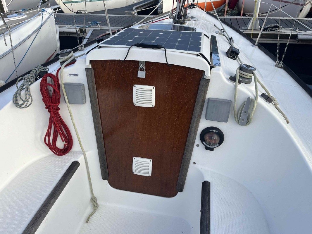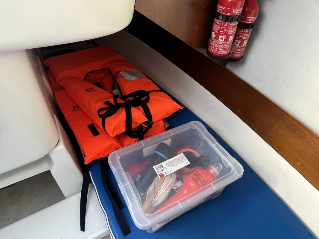 *Extérieur : Barre franche, Bi-safrans, 3 winchs (dont un neuf) + manivelle de winch, capot de descente, compas, coffres de rangement dans le cockpit sur tribord et bâbord, Béquilles d'échouage, Panneau solaire souple, Lignes de vie (2025), Réflecteur radar tube (2025)