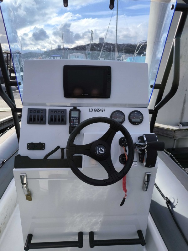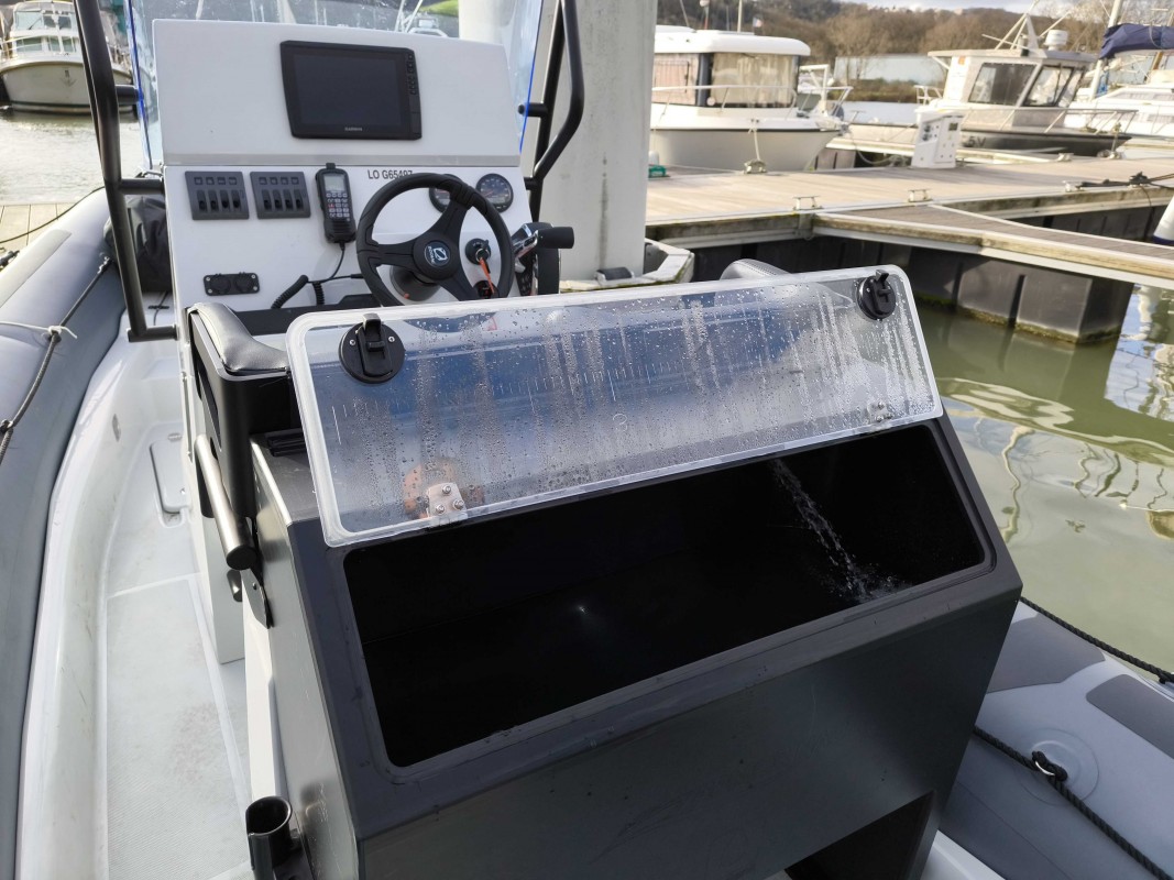 Équipements : Flotteur amovible en PVC, 1 bitte d'amarrage avant / 2 taquets arrières, 1 coupe-batterie, vide-poche avec prise 12V/USB, baille à mouillage verrouillable, siège bolster avec porte-cannes, coque polyester en V profond, échelle de bain, feux de navigation, banquette 3 places, valves Easy Push + vivier et Roll bar