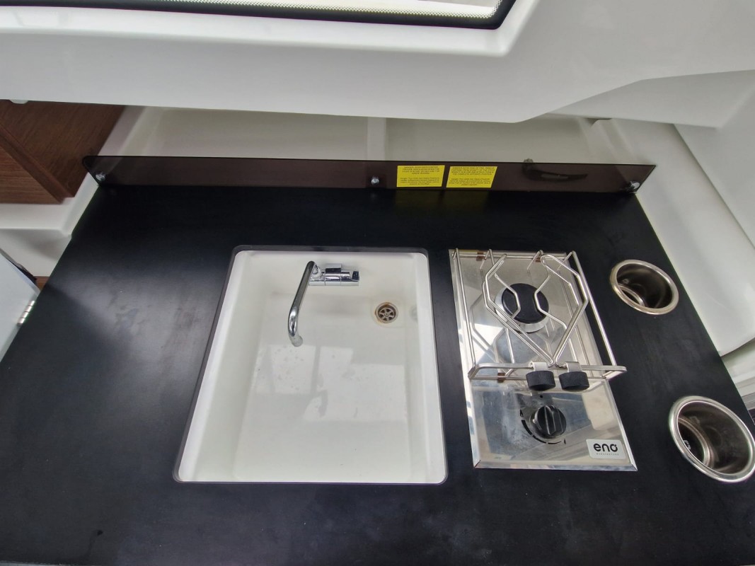 • Cuisine finition luxe (plan de travail avec finition en Arpa Noir, 2 porte-verres inox, réchaud gaz fixe, boîte à gaz)
