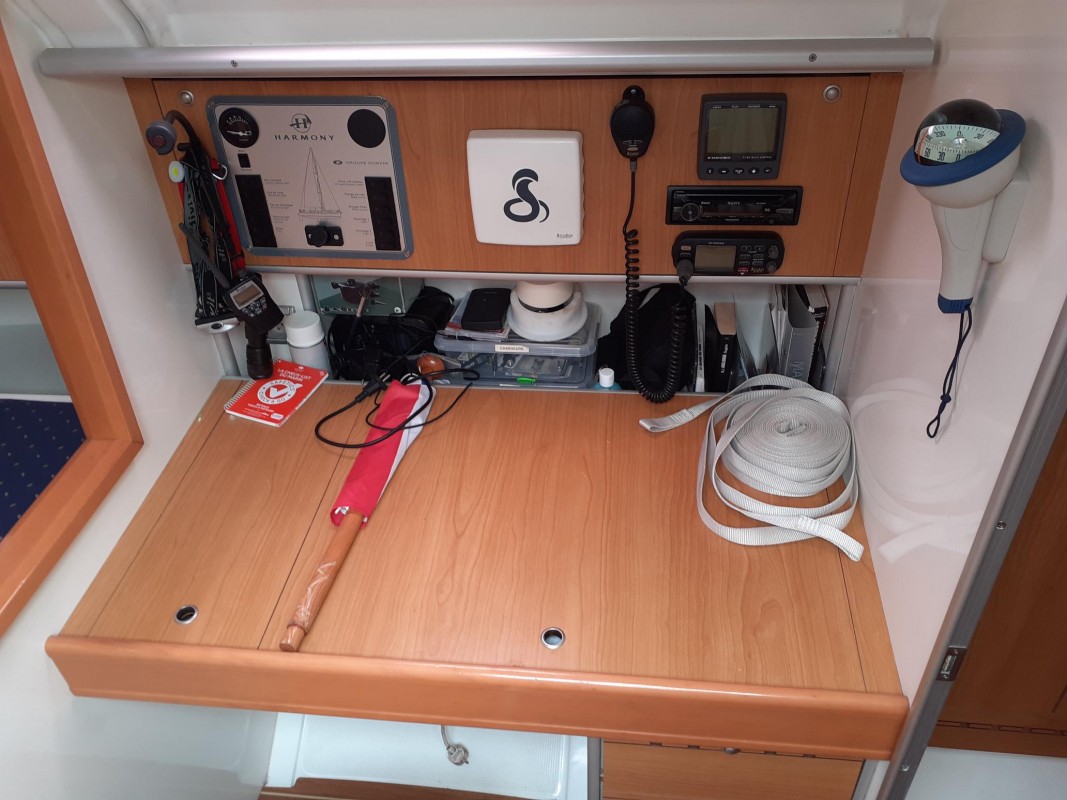 *Électronique : VHF fixe et portable, Lecteur de carte GPS Cobra, Sondeur / Loch FURUNO, Autoradio SONY USB, haut-parleurs extérieurs, 2 batteries de servitude + 1 batterie de démarrage (les trois changées en 2020), Pilote automatique sur colonne.