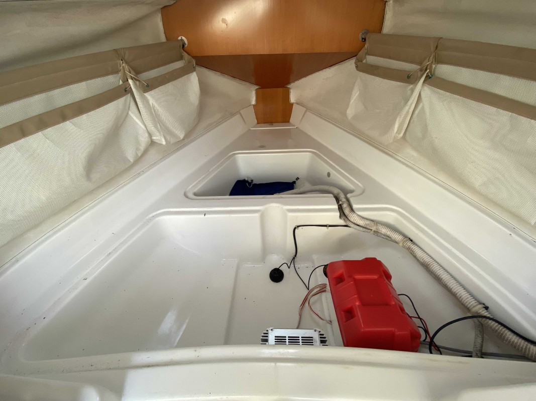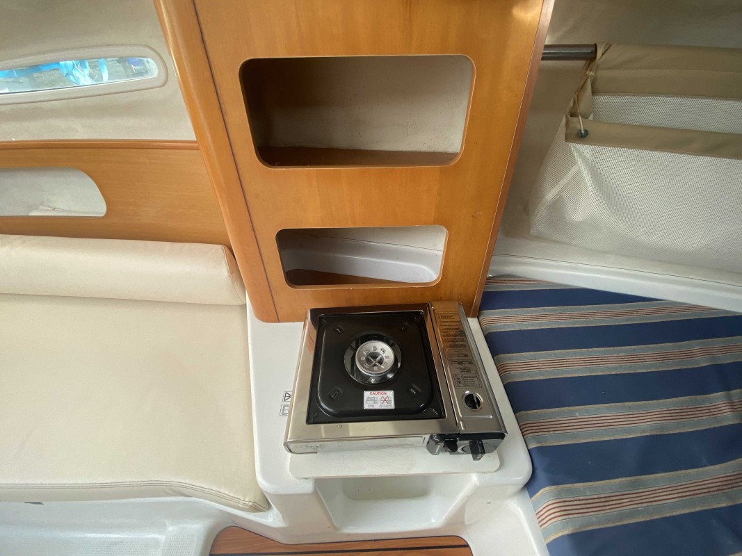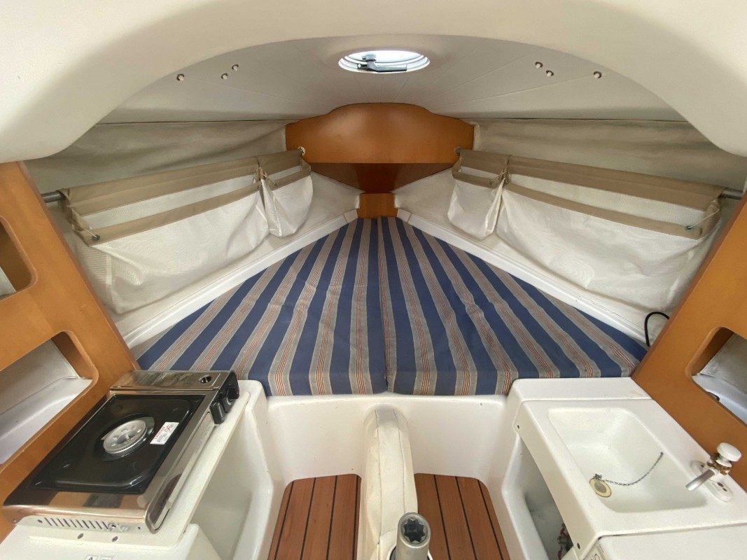 1 cabine, 4 couchages, 1 réchaud inox à gaz, nombreux rangements + filets de rangement, table repliable, hublot ouvrant de cabine, Sellerie d'origin en bon état