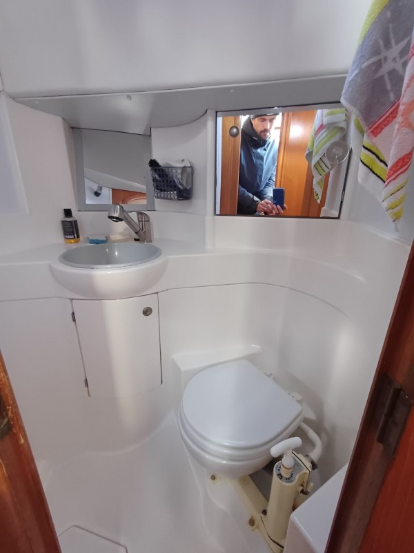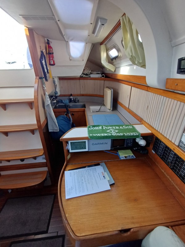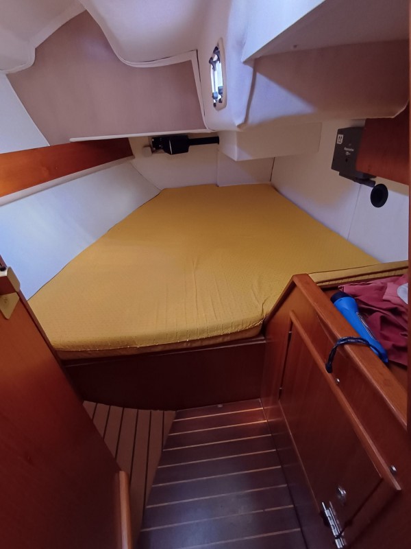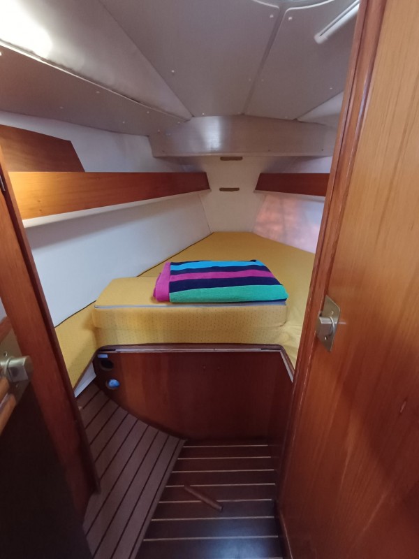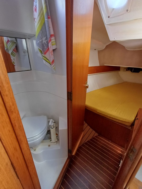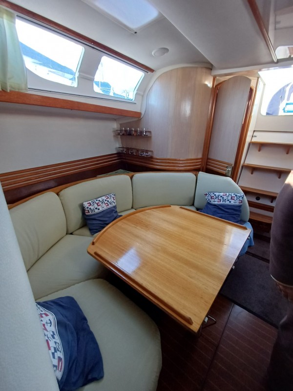 *Intérieur : Cabine avant avec couchette double - Cabinet de toilette à tribord avec wc - lavabo et douche - carré convertible à tribord- banquette et carte à table à bâbord - cuisine à bâbord avec évier double - réfrigérateur - gazinière - cabine arrière tribord avec grande couchette double- cabinet de toilette avec wc , lavabo et douche à tribord