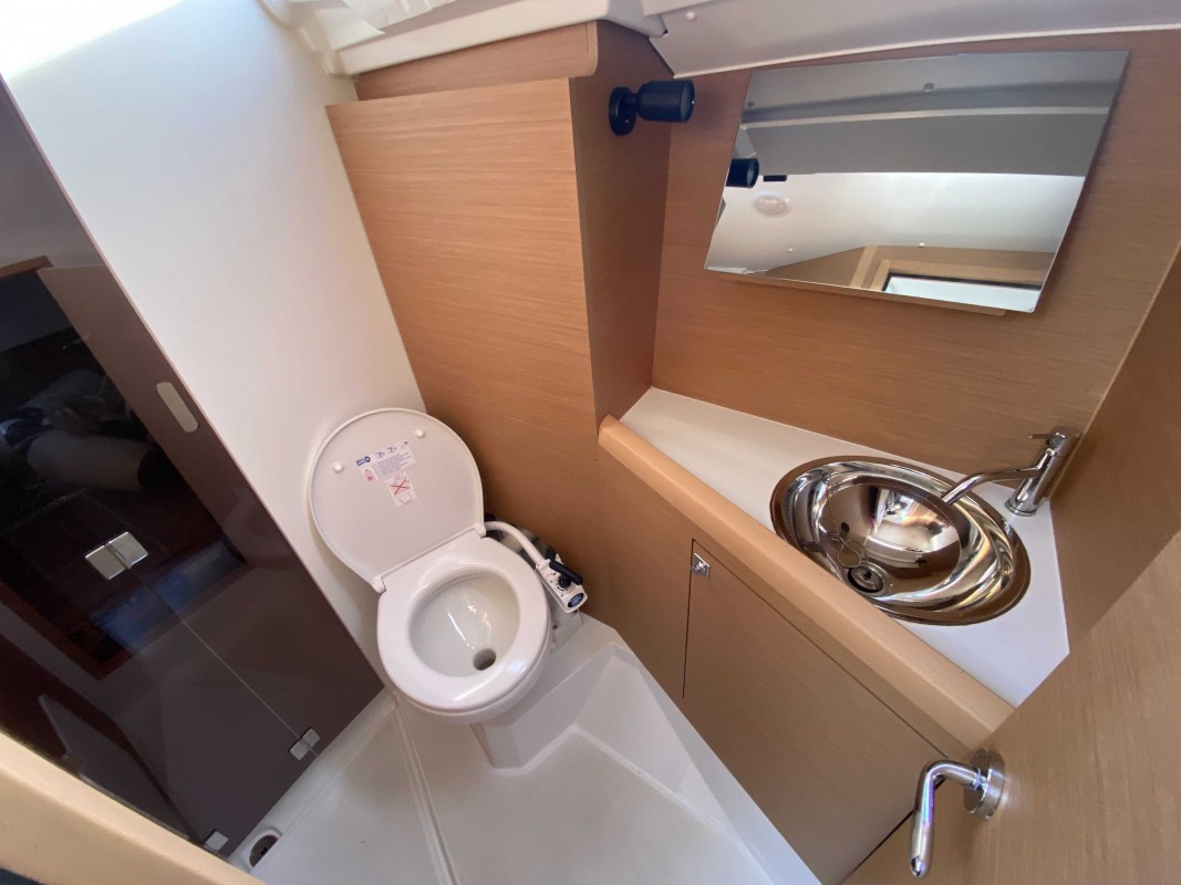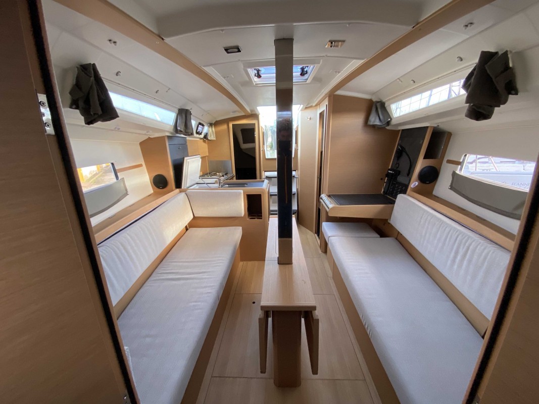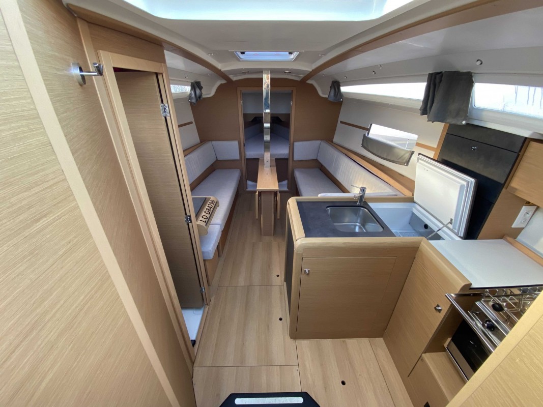*Intérieur : Version 2 cabines + 1 salle d'eau, Coin cuisine (Réchaud four/grill inox 2 feux, Réfrigérateur 100L, Nombreux rangements), Grand carré en vis-à-vis avec table repliable, Coin table à carte, Vaigrage de carré luxe, Stores pour panneaux et hublots + moustiquaires pour panneaux, Chauffe-eau 25L avec échangeur 220v, Douche séparée des WC, Prises USB dans les cabines, Pouf de carré, Hauteur sous barrot : 1.90 m.
